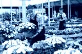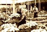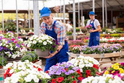 Enthusiastic gardener in plaid shirt and blue overalls setting up attractive display of petunia pots, preparing colorful blooms for customers at open sunlit garden center
