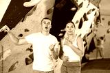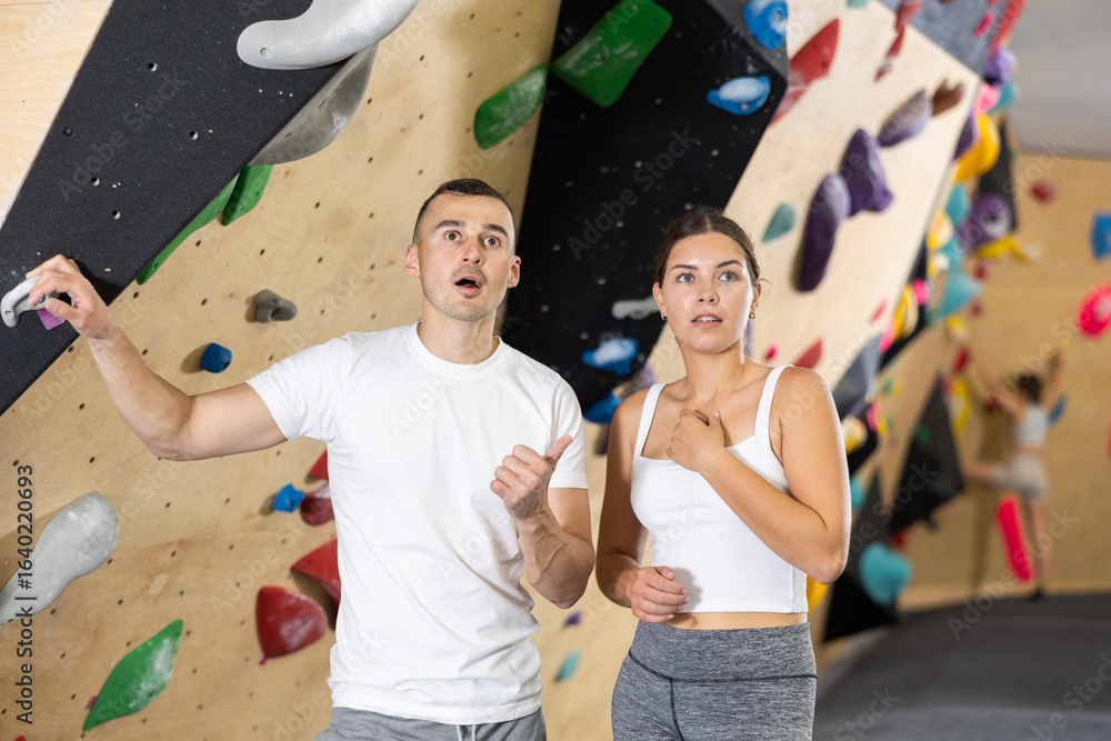 Two visitors of climbing hall are standing and relaxing, discussing active hobby. Guy and girl friends, standing and resting after overcoming obstacle course on artificial wall