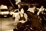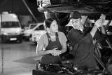 Skilled male auto-mechanic measuring capacity of automobile detail while female worker looking at him with interest in car workshop