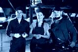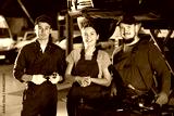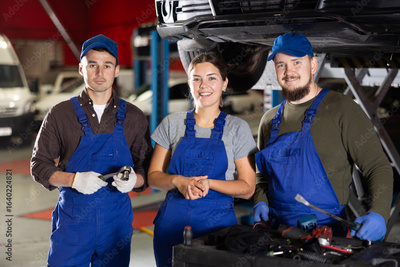 Two positive car mechanics standing with female worker in blue overalls inviting clients in auto service shop