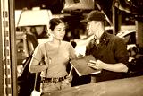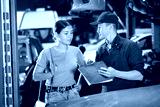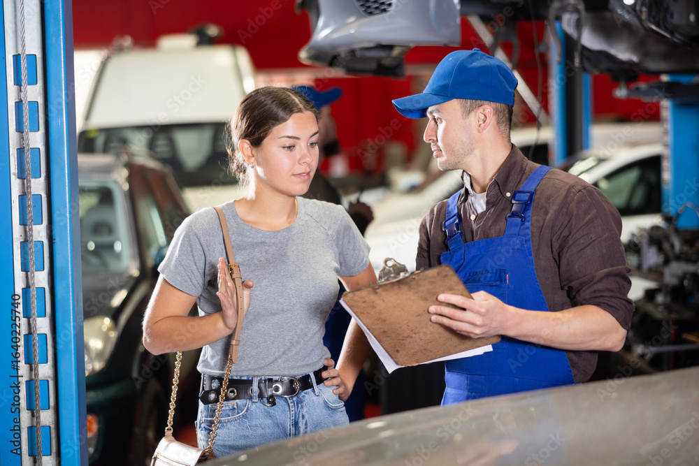 Mechanic guy signs agreement with young woman to repair car in car service center