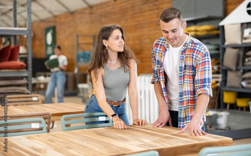 Girl with husband customer stay at table in garden furniture store, admiring its unique design and usability craftsmanship. They envisions working from home at this table