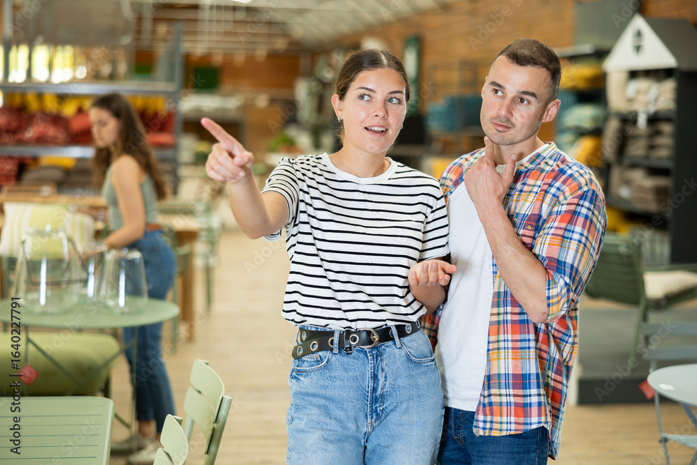 Positive friendly young adult couple, guy and girl, looking with interest for comfortable furniture for patio and garden of country house in home decor store