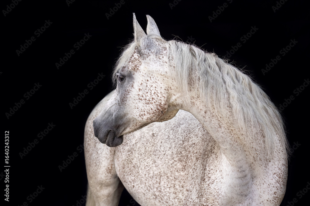 Arabian horse mare with white red roan coat color on black background – elegant horse black shot