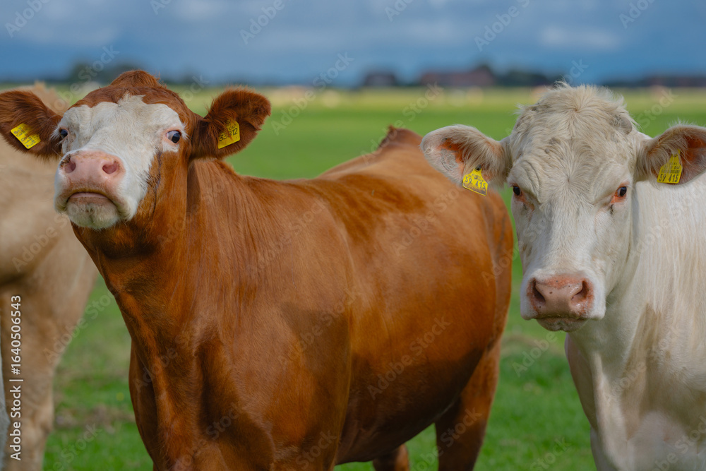 Cow grazing in a green pasture. Cow in the meadow. Livestock grazing in the countryside. Farm life with cattle and calves. Cow in a rural landscape. Ranch with grazing bovine. Dairy cow.