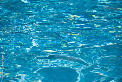 Blue pool water background. Blurred transparent clear calm water surface texture. Water waves in sunlight with copy space.