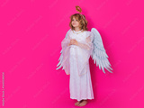 Cute angel child with prayer hands, hope and pray concept, studio portrait. Angel kid with angels wings, isolated background.
