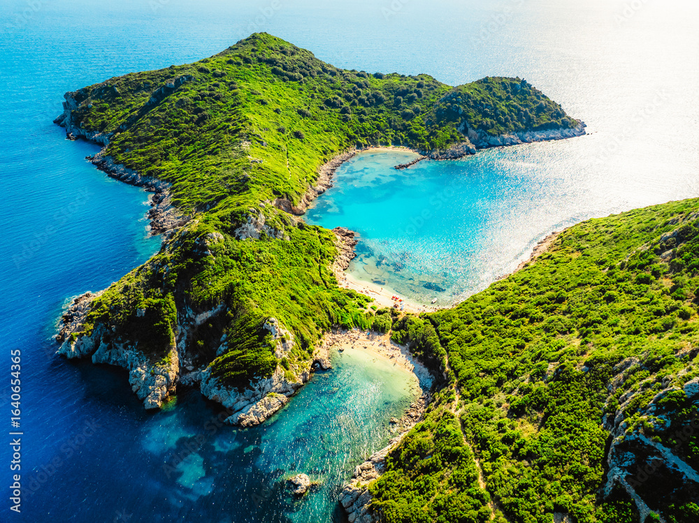 Porto Timoni bay with twin beaches and turquoise waters and sand beach on Corfu in Greece in Afionas region