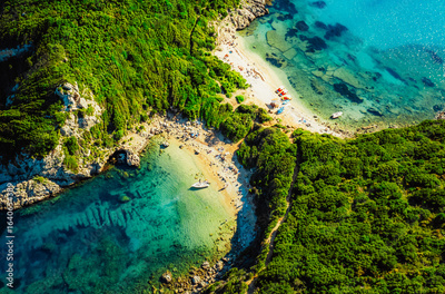 Porto Timoni bay with twin beaches and turquoise waters and sand beach on Corfu in Greece in Afionas region