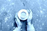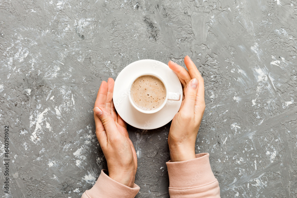 Minimalistic style woman hand holding a cup of coffee on Colored background. Flat lay, top view cappuccino cup. Empty place for text, copy space. Coffee addiction. Top view, flat lay