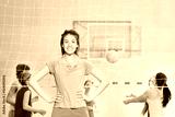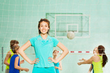 Happy Asian girl, volleyball team member, in gym