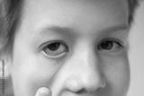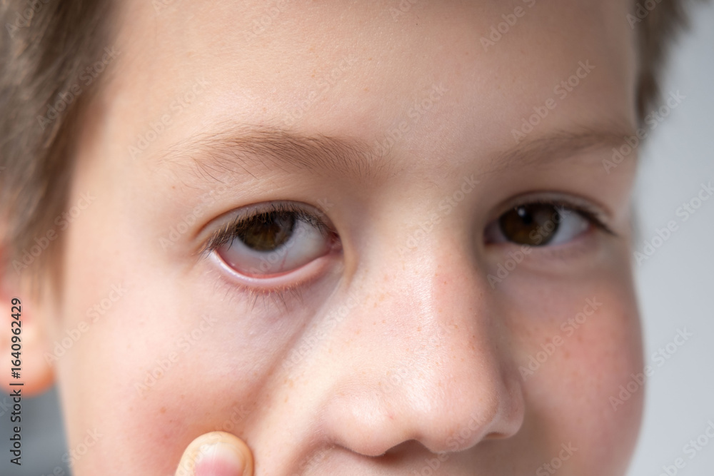 Close-up child brown eye, finger pulling lower eyelid, playful gesture, curiosity, childhood expression, macro portrait, human face detail, boy making funny face close-up