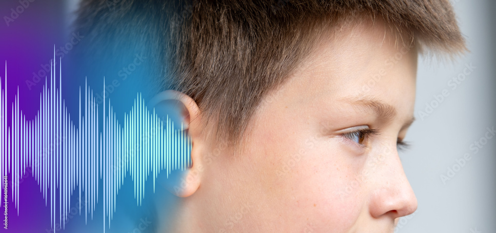 ear closeup, child listening, sound wave, acoustics and sound vibrations, Auditory System, Hearing Test, Cochlear implant, Assistive listening device