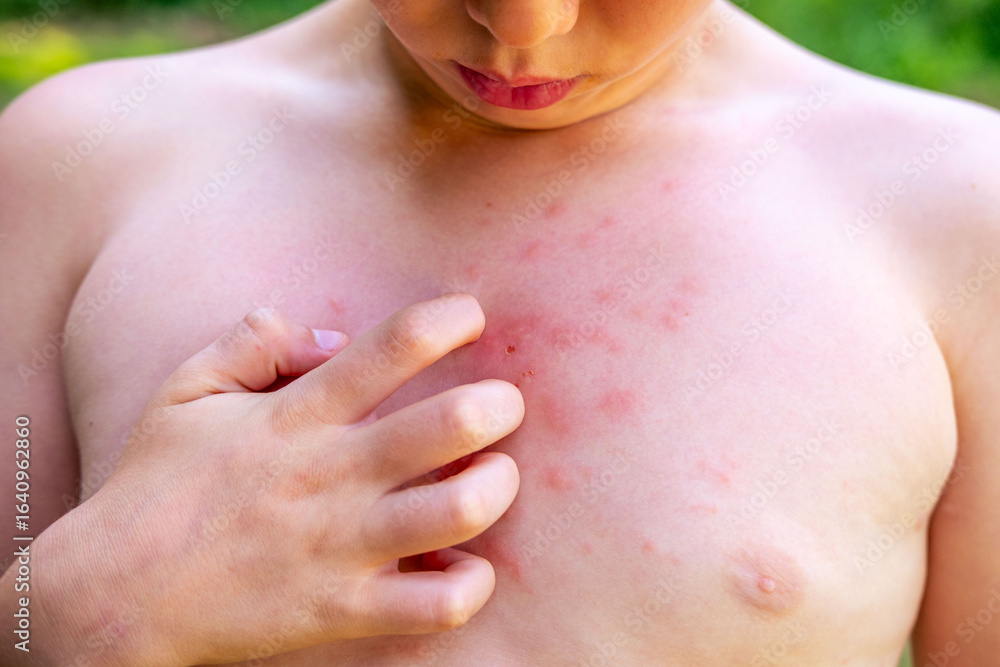 Preteen Child boy with red insect bug bites and rash on skin, scratching irritated skin, expressing mild pain, dermatology, rash treatment, allergic reaction, healthcare problem