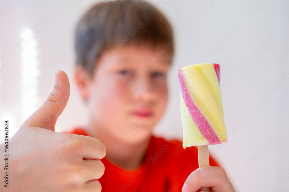 happy boy enjoys delicious colorful fruit popsicle, fruit ice pop, tasting sweet summer dessert, Summertime sweetness, Childhood memories, childhood joy, sweet refreshment, Simple Summer joys