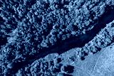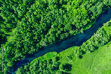Aerial drone view of deep blue river and green summer woods and grass fields