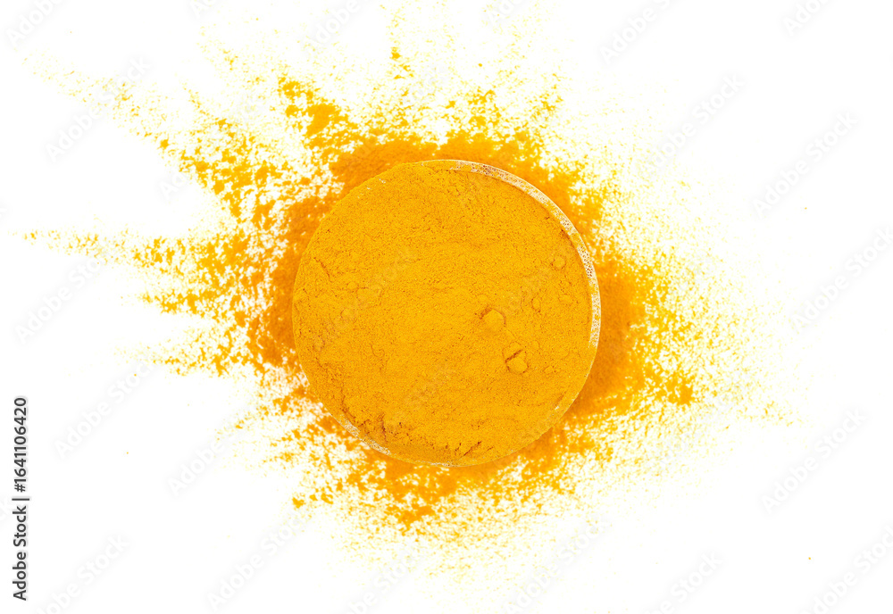 Turmeric powder pile in bamboo bowl isolated on white, top view