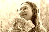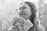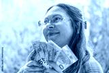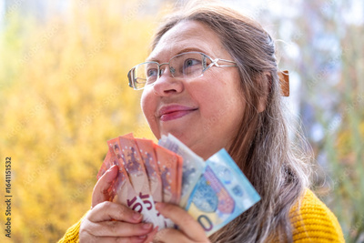Mature white woman 50 years old, presenting, counts euro banknotes in hand, cash payments, savings, exchange and cashing currency, financial freedom