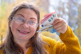 Mature white woman 50 years old, presenting, counts euro banknotes in hand, cash payments, savings, exchange and cashing currency, financial freedom
