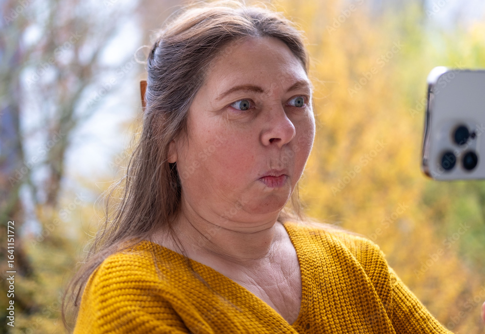 Mature positive white woman with long hair and yellow sweater using modern phone mount outdoors, snapping selfie, steady grip