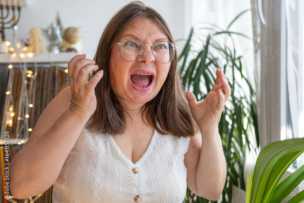Angry mature woman arguing, blaming, frustrated aggressive yelling, accusation emotion, emotional outburst portrait, stress body language