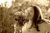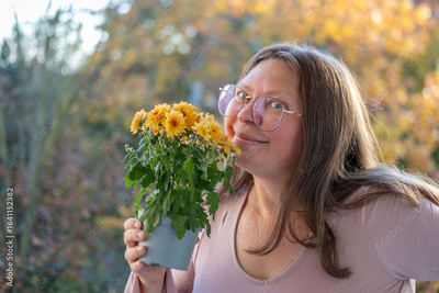 mature woman and autumn flowers, sensitivity to pollen, Allergy awareness, emotional wellbeing, and self-love, Floral gift on cozy day, enjoying nature