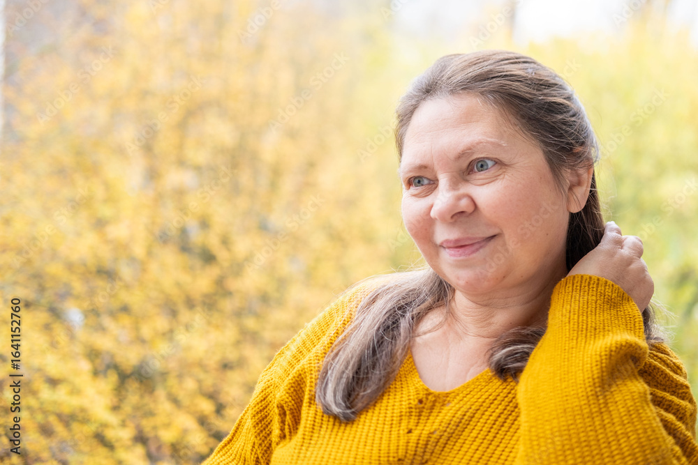 Happy mature woman with long hair smiling, positive emotion, self care, natural aging beauty, closeup portrait, healthy lifestyle, close face view, wellness theme