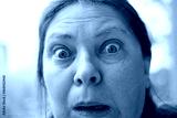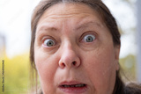 Amazed woman stares in shock, eyes wide open, bulging eyes, expressing disbelief and unexpected news, human emotion