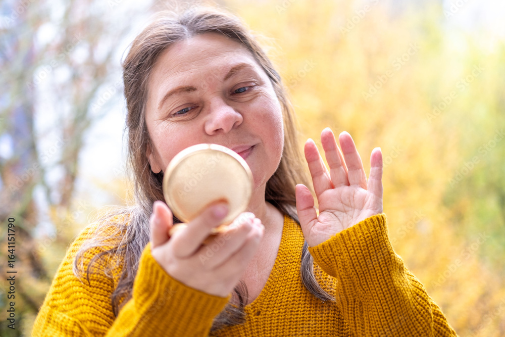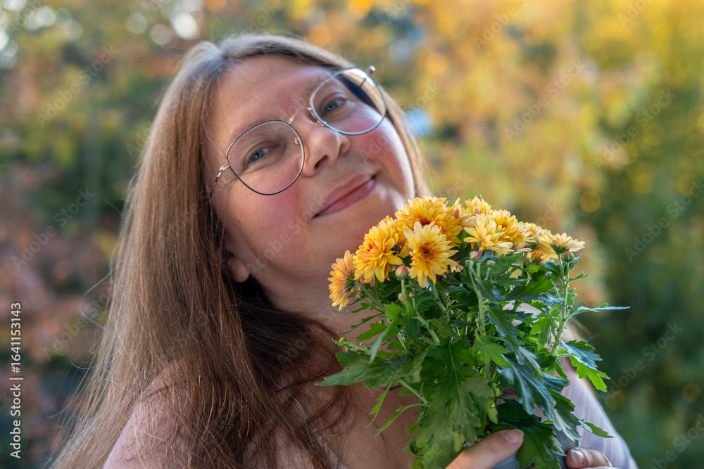 flower gift, Autumn's gentle embrace, woman's serene moment with aster blooms, essence of fall, graceful connection to vibrant aster season, possibly causing allergy