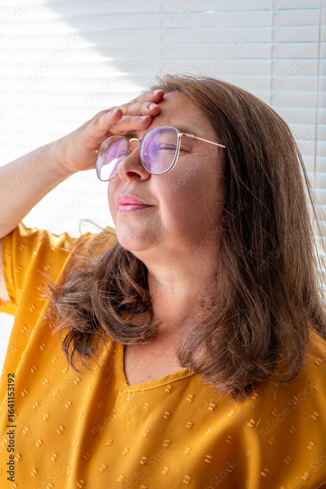 Mature Sad woman suffering, head pain, menopause symptom, Woman with headache, fever, high pressure, hormonal problem, temperature spike