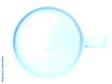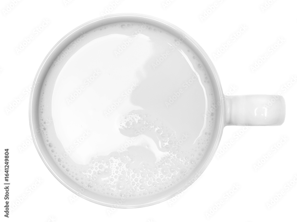 Fresh milk in porcelain cup with bubbles isolated on white, top view, clipping path