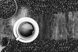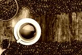 Coffee cup and beans on old wood table. Top view with copy-space for your text