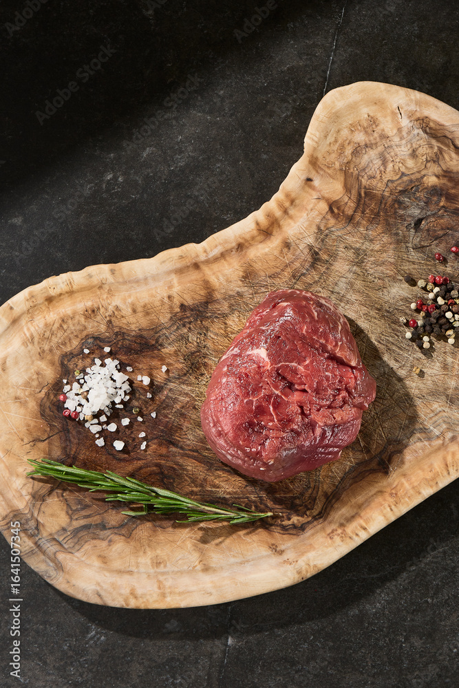Filet mignon steak rustic lighting overhead composition on textured wooden board