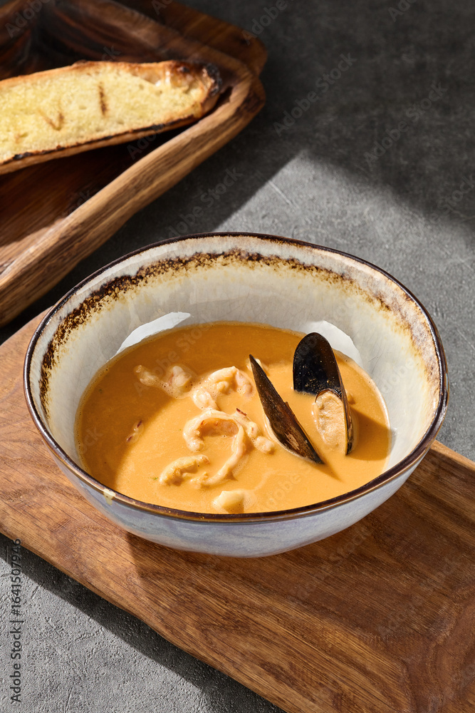 Seafood chowder in rustic bright closeup, artisan bowl and toasted bread on natural wood