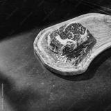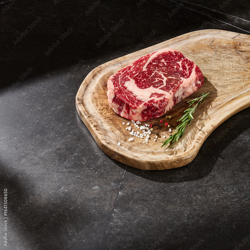 Ribeye steak on wooden board, bright natural lighting, overhead composition