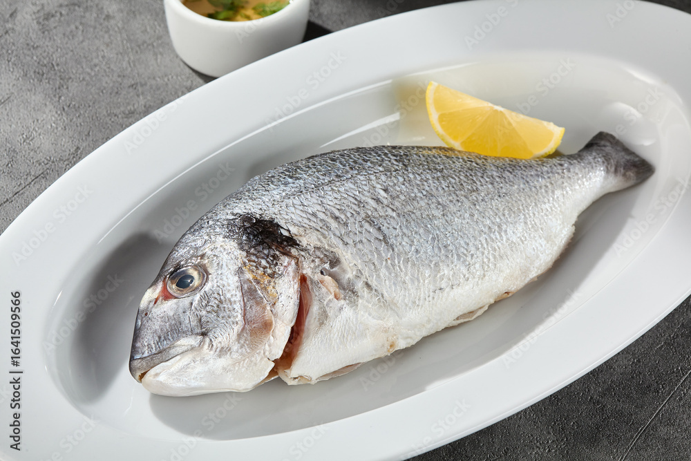Fresh dorado fish on white plate with lemon, bright lighting, overhead composition