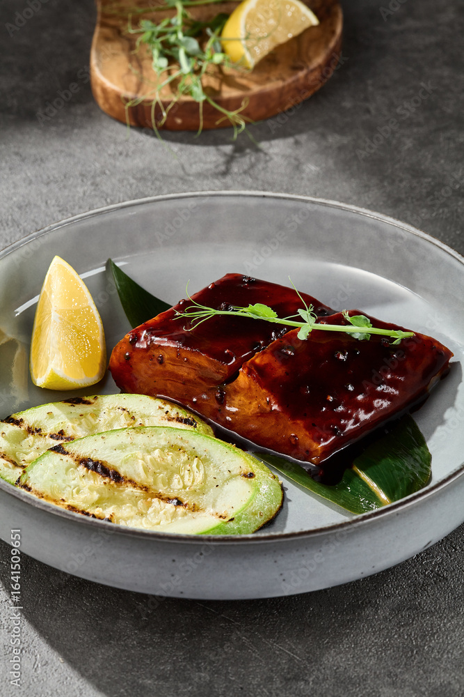 Teriyaki-glazed salmon bright studio lighting, overhead composition with grilled zucchini and lemon garnish