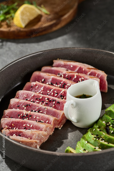 Grilled tuna steak with avocado slices, bright directional lighting, closeup composition