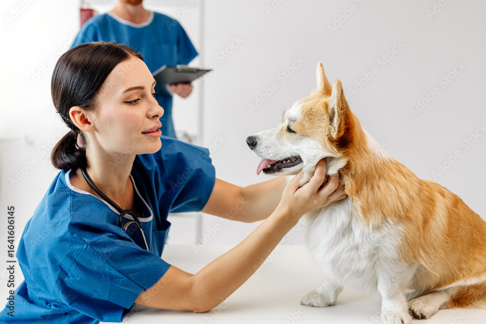 Female veterinarian in blue scrubs gently examines a corgi dog in a bright veterinary clinic, showcasing compassionate care and professional veterinary practices for pet health and well-being