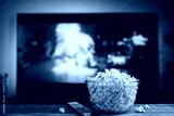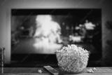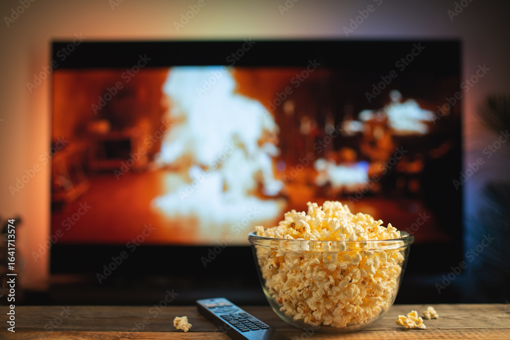 A glass bowl of popcorn and remote control in the background the TV works. Evening cozy watching a movie or TV series at home