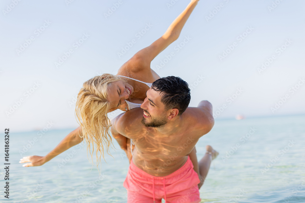 Joyful couple enjoying a playful moment at the beach on a sunny day