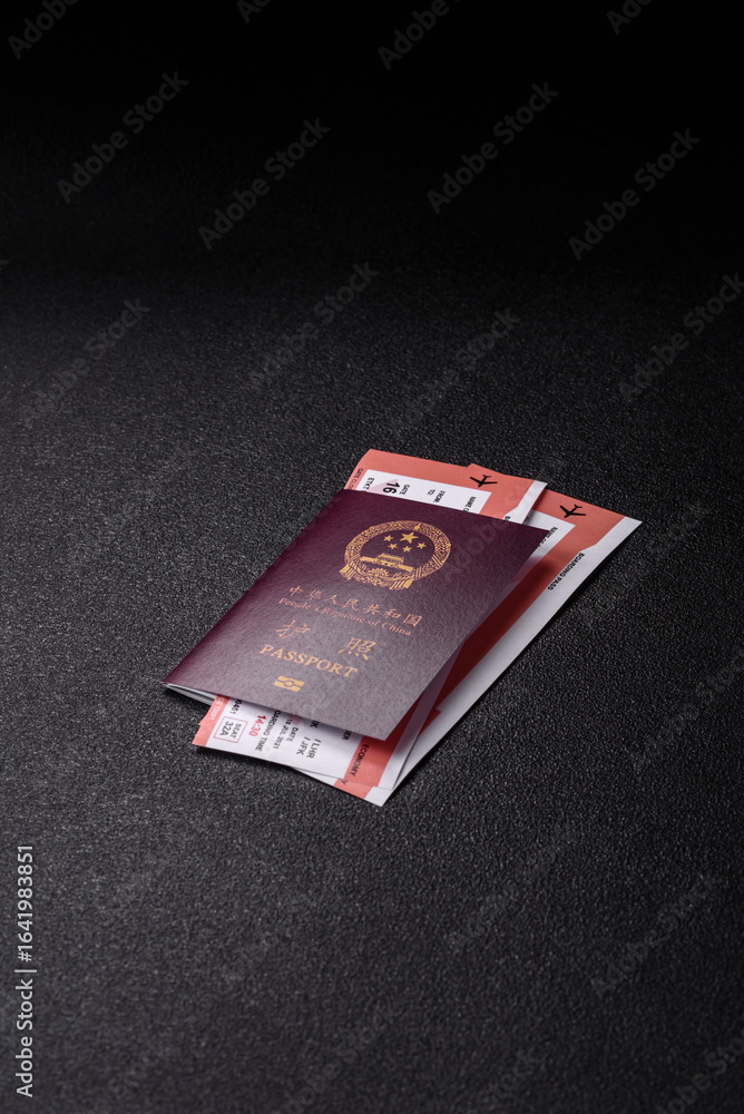 China, Chinese passport with money and flight tickets. Chinese passport with tickets