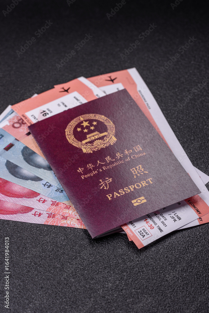 China, Chinese passport with money and flight tickets. Chinese passport with tickets