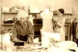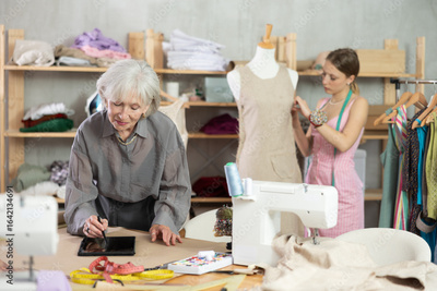 Elderly woman seamstress draws pattern using tablet young woman assistant sews on mannequin in workshop