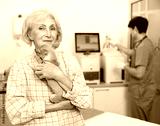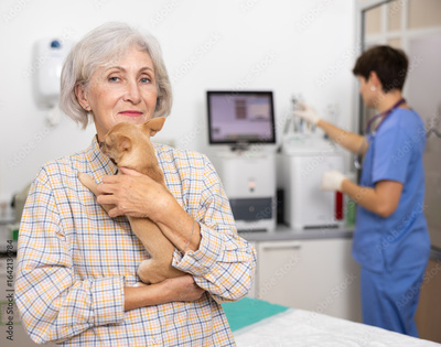 Portrait of smiling caring aged female owner of cute chihuahua bringing little pet to veterinary clinic for routine checkup or vaccination