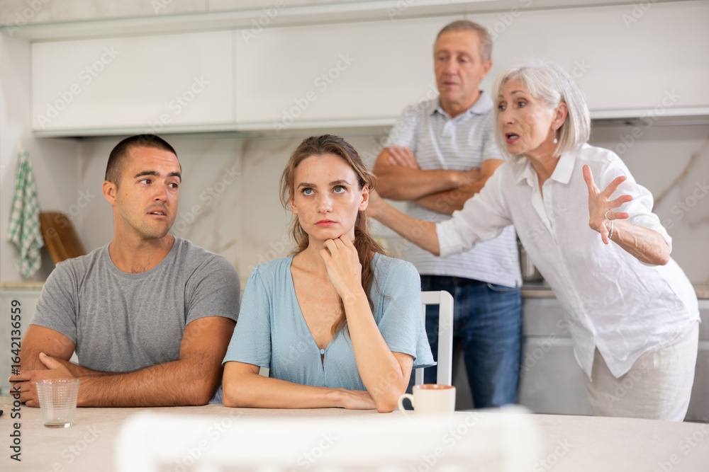 Girl and guy are sitting in kitchen and do not listen to their father and mother