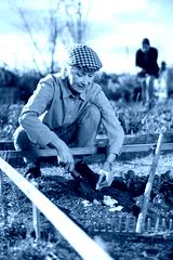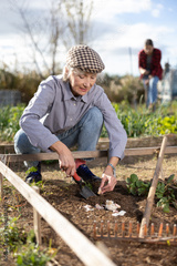 Mature woman farmer squatting on heaps and using chopper to plant garlic in soil during work in vegetable garden on sunny day of spring