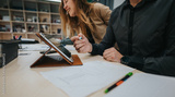 Colleagues working together in an office environment, discussing a project with charts and notes. Their teamwork and mutual focus highlight effective collaboration and workplace productivity.