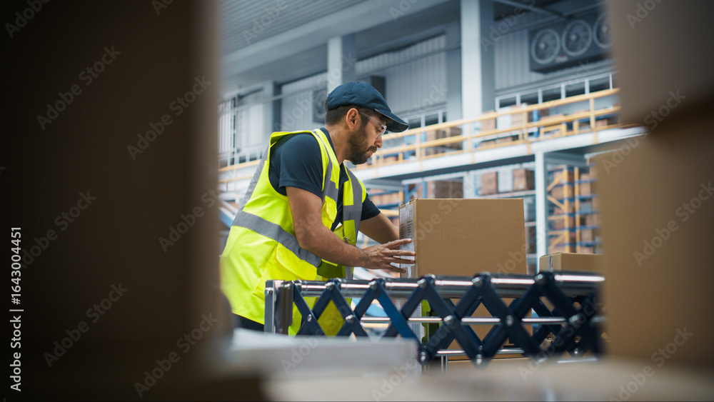 Multiethnic Male Loader Putting Boxes On Automated Conveyor Belt In Modern Distribution Warehouse. Man In Reflective Work Jacket Loading Packages With Online Orders For Delivery To Customers Worldwide