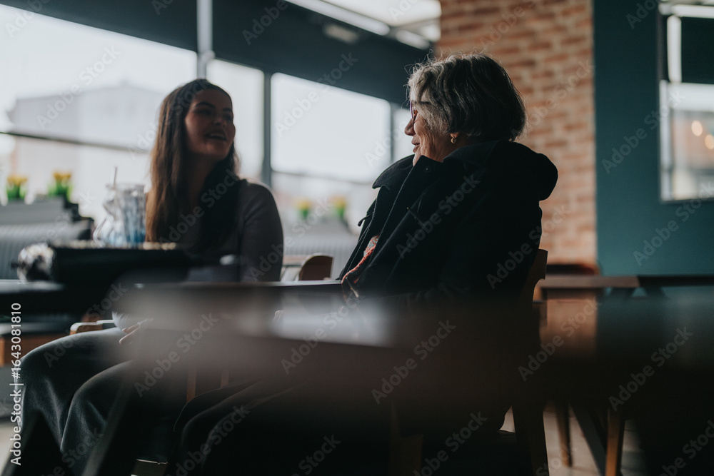A serene moment shared between an elderly woman and a young adult as they talk and laugh together at a coffee shop, surrounded by natural lighting and a calm atmosphere.